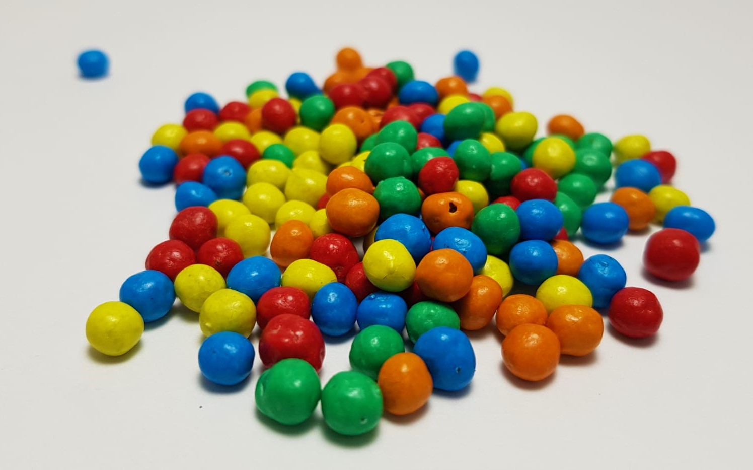 Bolinhas com revestimento colorido, em açúcar e cereal no interior.