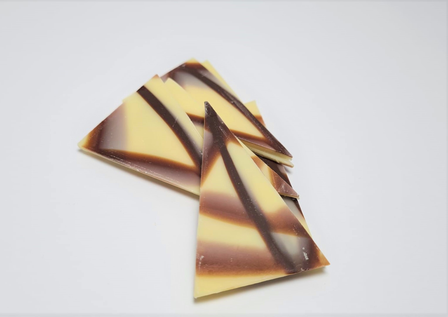 Triângulos em chocolate branco, com apontamentos em chocolate de leite.